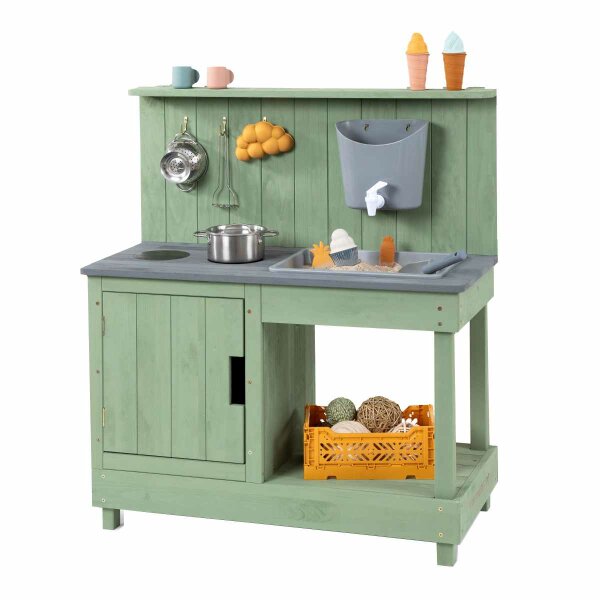 With a modern Scandinavian look, the mud kitchen blends harmoniously into the garden, patio or balcony. The sturdy construction has everything a child's heart could desire: a removable plastic tub for mudding, two printed hot plates, a water tank with tap for real running water, a shelf, hooks for kitchen accessories and a large storage compartment with door. There is also storage space above the back wall.
