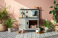 With a modern Scandinavian look in warm grey, the mud kitchen blends harmoniously into the garden, patio or balcony. The sturdy construction has everything a child's heart could desire: a removable plastic tub for mudding, two printed hot plates, a water tank with tap for real running water, a shelf, hooks for kitchen accessories and a large storage compartment with door. There is also storage space above the back wall.